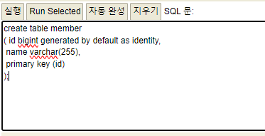 블록지정된 박스에 member 테이블을 생성하는 sql문을 입력한다.