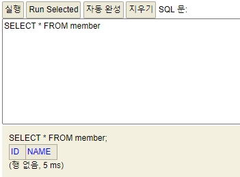 SELECT * FROM member 쿼리를 날리면 아래와 같이 정상적으로 데이터베이스가 생성된 것을 확인할 수 있다.