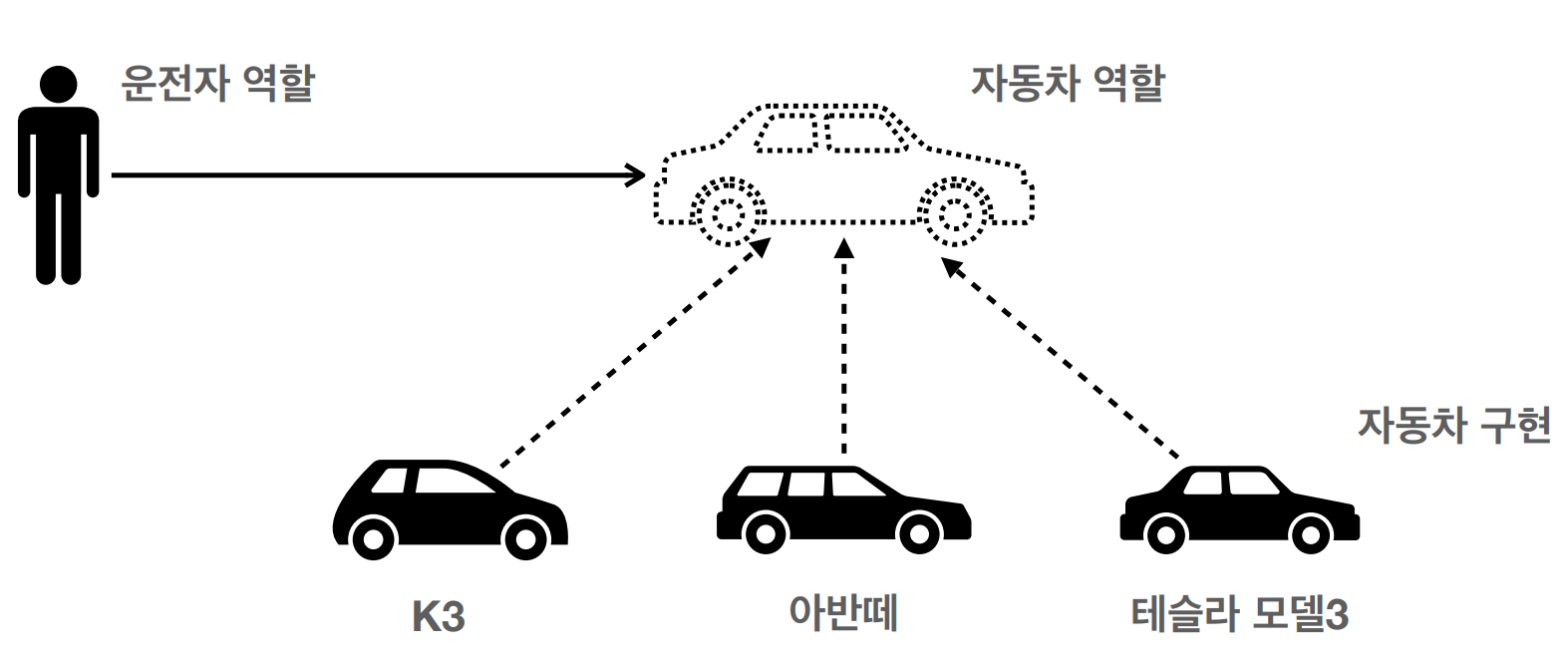 자동차 역할을 K3, 아반떼, 테슬라 세 개의 다른 자동차가 구현을 함.