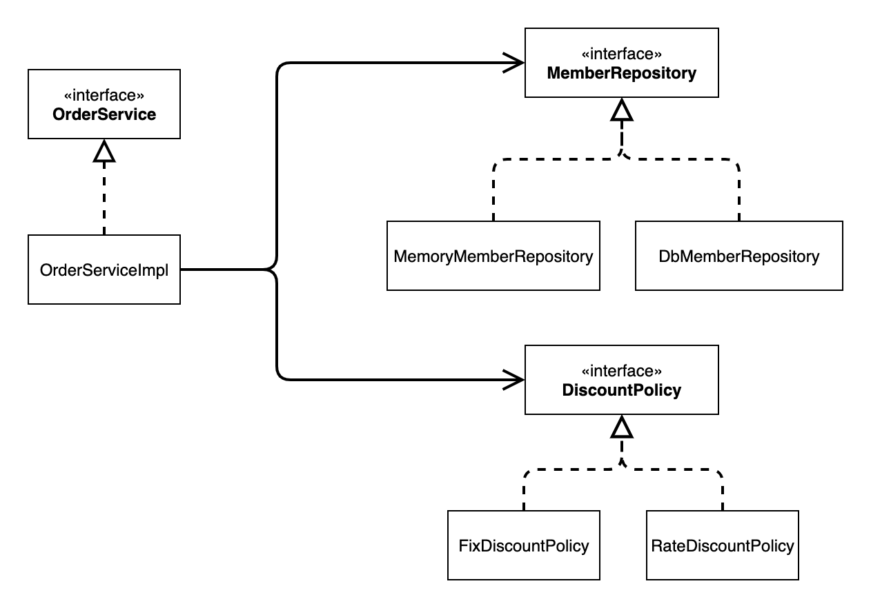 회원을 메모리가 아닌 실제 DB에서 조회하고, 정률 할인 정책(주문 금액에 따라 % 할인)을 지원해도 주문 서비스를 변 경하지 않아도 된다. 협력 관계를 그대로 재사용 할 수 있다.