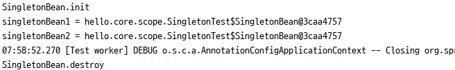 빈 초기화 메서드를 실행하고, 같은 인스턴스의 빈을 조회하고, 종료 메서드까지 정상 호출 된 것을 확인할 수 있다.