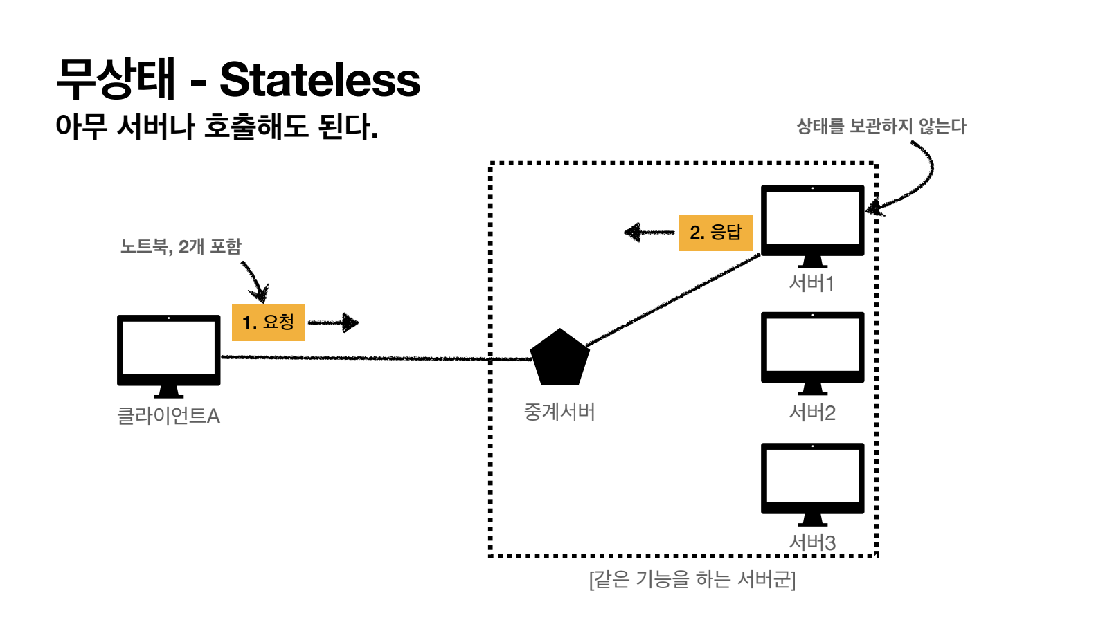 클라이언트가 상품을 구입할 때 애초에 필요한 상품 정보와 결제 정보를 담아서 요청을 하면 서버에서는 상태를 보존하지 않고 응답만 한다.
