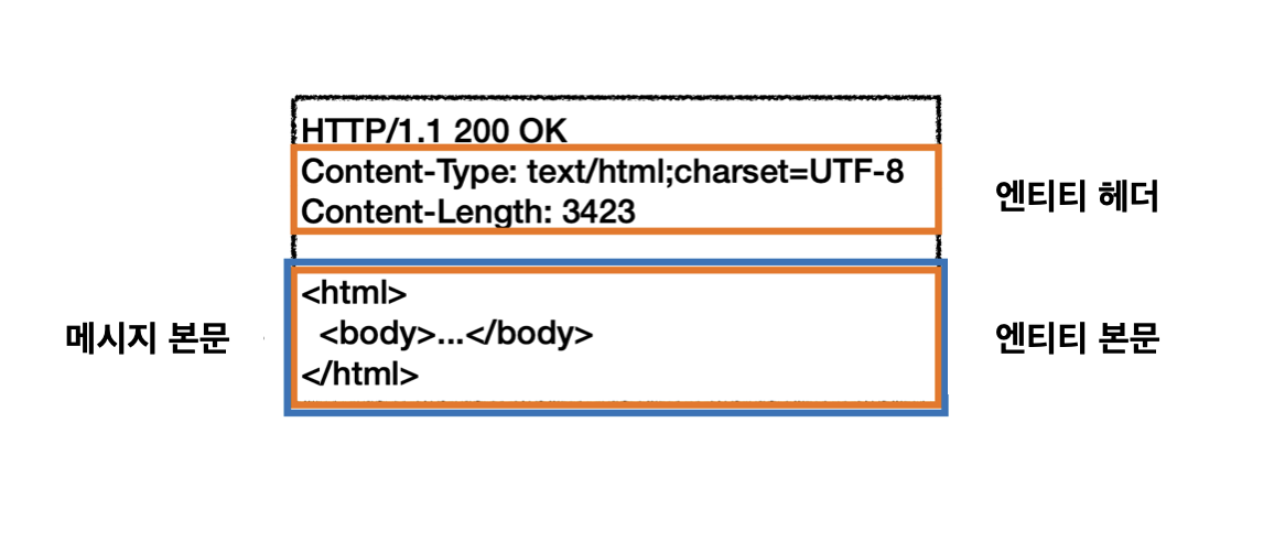 - Entity 헤더: 엔티티 바디 정보 (Content-Type: text/html, Content-Length: 3423 등)