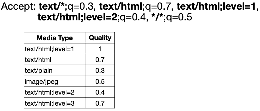 클라이언트에서 요청한 text/html;level의 우선순위가 가장 높고 서버가 해당 미디어 타입을 지원하므로 text/html;level 미디어타입으로 응답한다.
