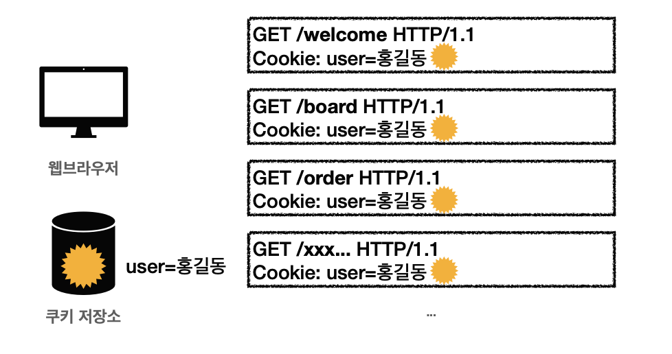 - 이후 웹 브라우저가 쿠키 접근가능한 도메인에 요청을 보낼 때마다 자동으로 쿠키 저장소에서 꺼낸 sessionId(쿠키)를 Cookie에 담아 서버에 요청을 보냄