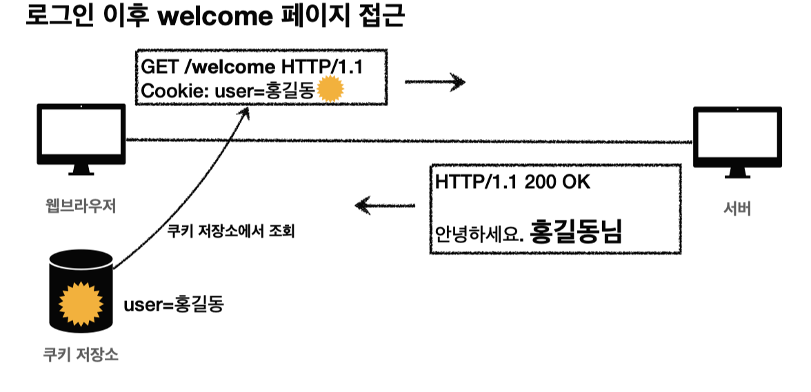 로그인 이후에 웹 브라우저가 /welcome에 들어오면 자동으로 웹 브라우저는 쿠키를 담아 서버에 요청한다.