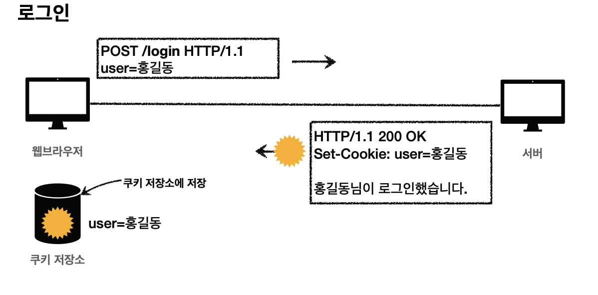 로그인을 하면 서버에서는 Set-Cookie로 홍길동 정보를 쿠키로 만들어서 보내준다.