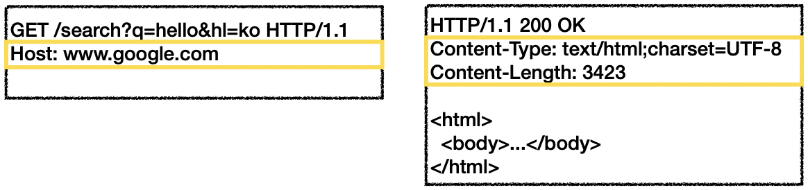 - Entity 헤더: 엔티티 바디 정보 (Content-Type: text/html, Content-Length: 3423 등)