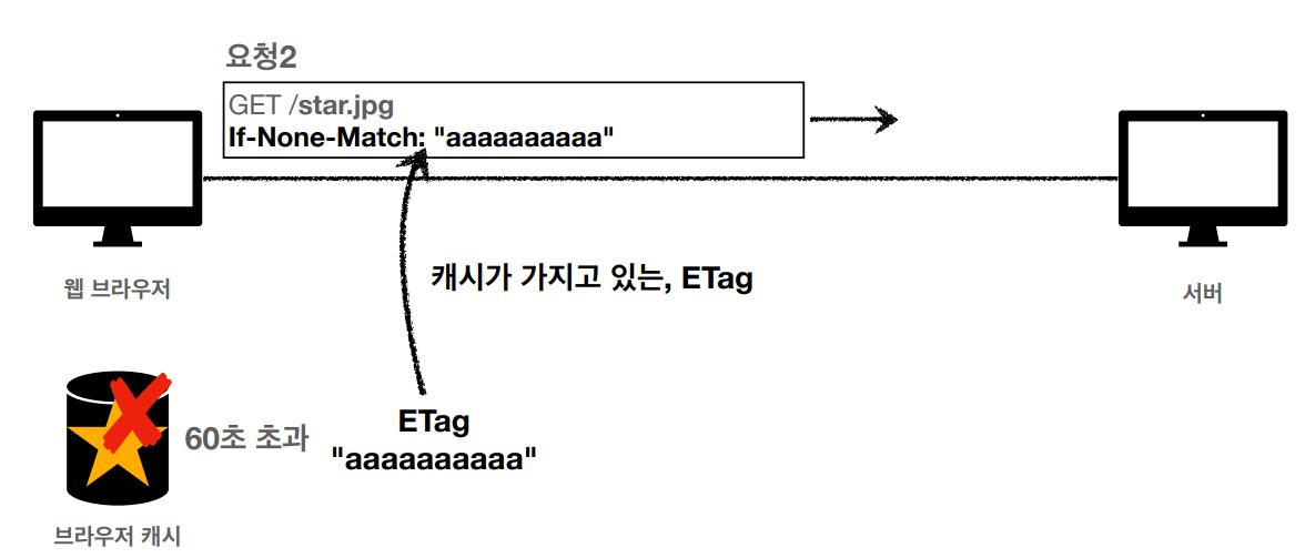 설정하였던 캐시가 시간 초과가 될 경우, if-None-Match: ETag 로 서버에 데이터가 아직 변함 없는지 확인 요청을 보낸다.