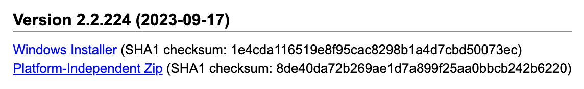 Downloads Version 2.2.224 (2023-09-17) Windows Installer (SHA1 checksum: 1e4cda116519e8f95cac8298b1a4d7cbd50073ec) Platform-Independent Zip (SHA1 checksum: 8de40da72b269ae1d7a899f25aa0bbcb242b6220) Version 2.1.214 (2022-06-13) Windows Installer (SHA1 check