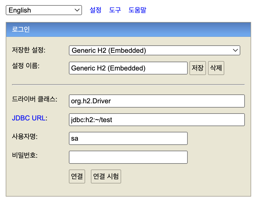 JDBC URL을 jdbc:h2:~/test로 최초 한번 설정해준다.