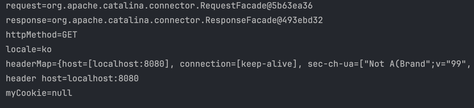 - @RequestHeader("host") String host 특정 HTTP 헤더를 조회한다.