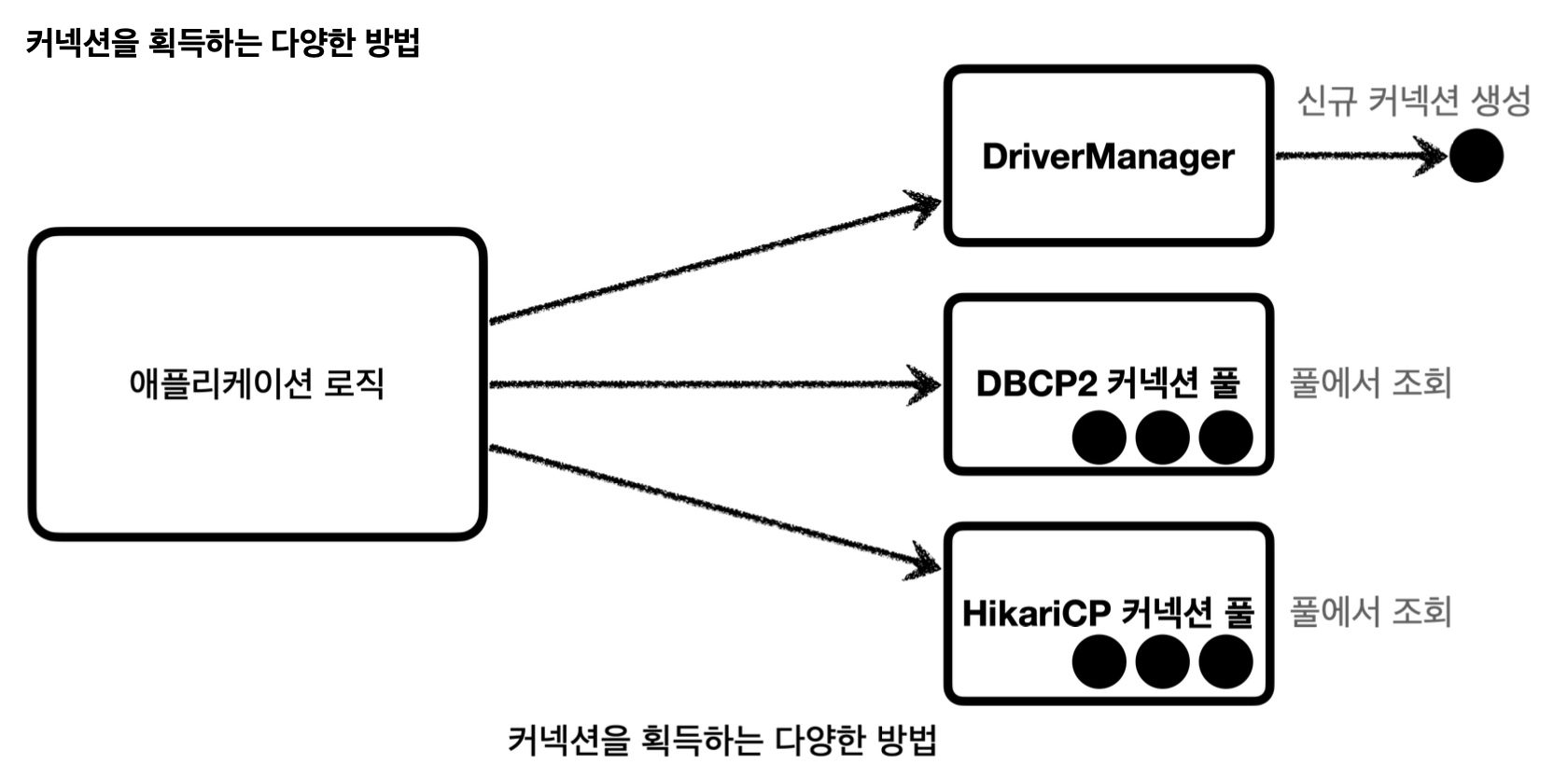 데이터베이스의 커넥션을 얻는 방법은 JDBC DriverManager 를 직접 사용하거나, 커넥션 풀을 사용하는 등 다양한 방법이 존재한다.