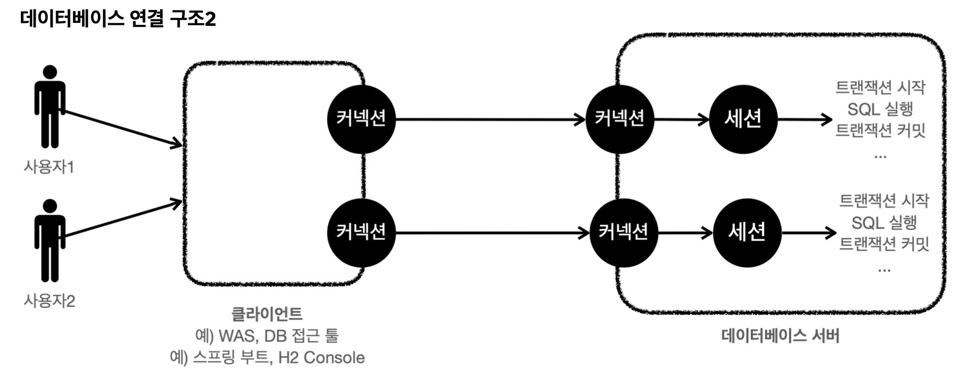 쉽게 이야기해서 개발자가 클라이언트를 통해 SQL을 전달하면 현재 커넥션에 연결된 세션이 SQL을 실행한다. 세션은 트랜잭션을 시작하고, 커밋 또는 롤백을 통해 트랜잭션을 종료한다. 그리고 이후에 새로운 트랜잭션을 다 시 시작할 수 있다.