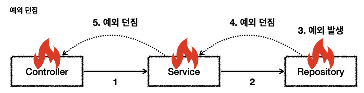 - 런타임 예외이기 때문에 서비스, 컨트롤러는 해당 예외들을 처리할 수 없다면 별도의 선언 없이 그냥 두면 된다.