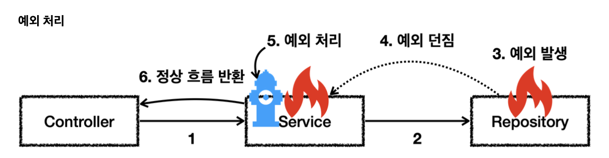 5번에서 예외를 처리하면 이후에는 애플리케이션 로직이 정상 흐름으로 동작한다.