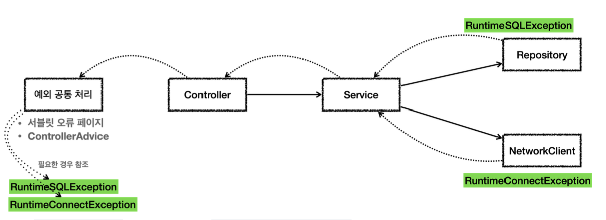- 서비스는 리포지토리와 NetworkClient를 둘다 호출한다. 따라서 두 곳에서 올라오는 체크 예외인 SQLException과 ConnectException을 처리해야 한다.