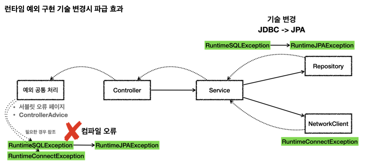 런타임 예외를 사용하면 중간에 기술이 변경되어도 해당 예외를 사용하지 않는 컨트롤러, 서비스에서는 코드를 변경하지 않아도 된다.