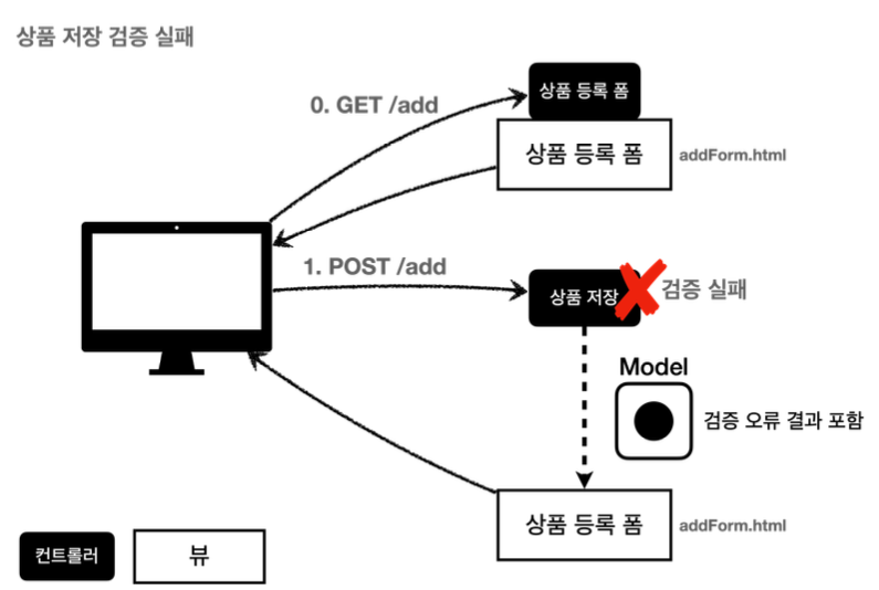 그래서 오류가 발생한 경우 사용자 입력 값을 보관하는 별도의 방법이 필요하다. 그리고 이 렇게 보관한 사용자 입력 값을 검증 오류 발생시 화면에 다시 출력하면 된다.