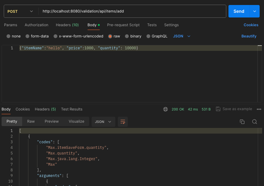 - 검증 오류 요청: JSON을 객체로 생성하는 것은 성공했고, 검증에서 실패함