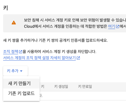 만든 계정의 키 관리 버튼을 누른다.