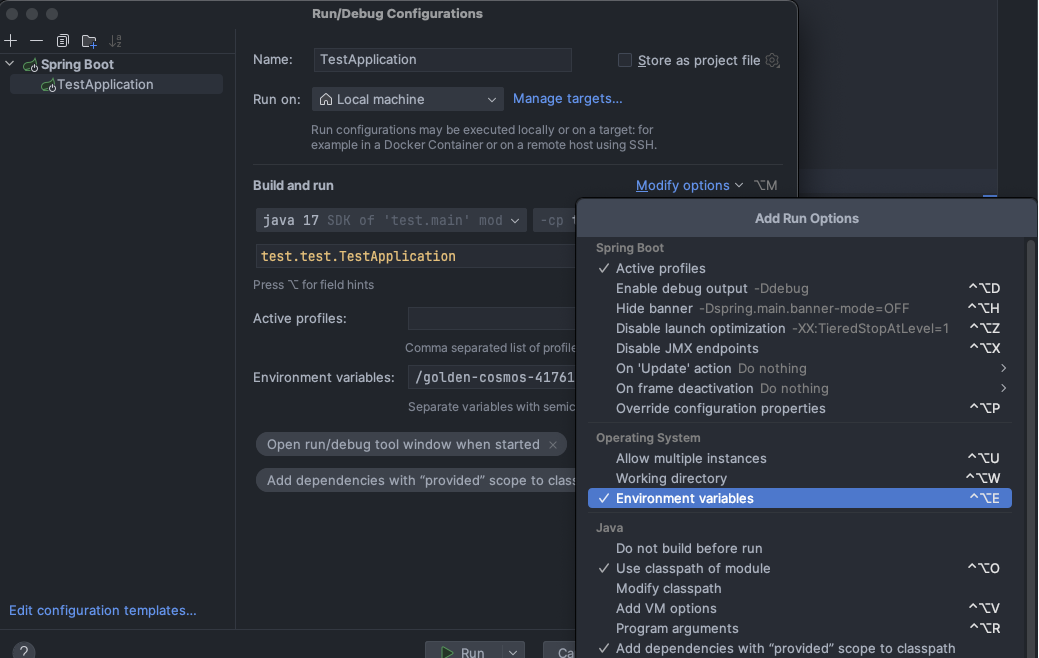 Modify Options 를 누르고 Environment variables 를 눌러 환경 변수를 추가해준다.