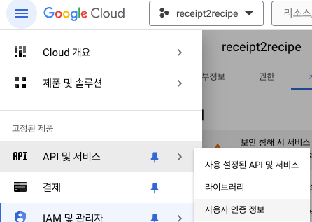 구글 클라우드 의 콘솔 창으로 들어가면 왼쪽 상단의 버튼을 눌러 API 및 서비스 - 사용자 인증 정보로 들어간다.