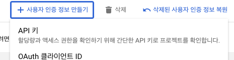 구글 클라우드 의 콘솔 창으로 들어가면 왼쪽 상단의 버튼을 눌러 API 및 서비스 - 사용자 인증 정보로 들어간다.