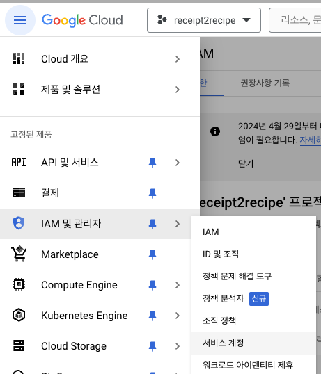 IAM 및 관리자 - 서비스 계정 버튼 클릭