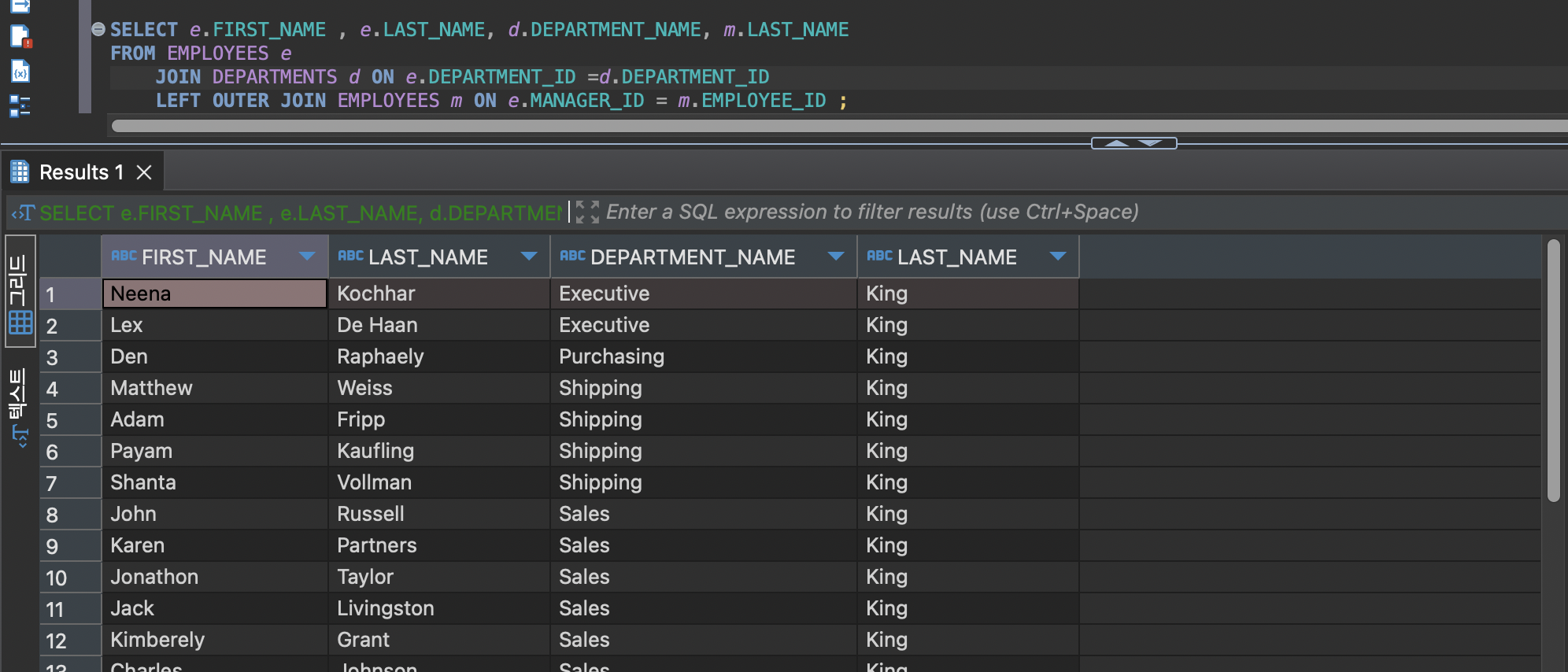 LEFT OUTER JOIN EMPLOYEES m ON e.MANAGER_ID = m.EMPLOYEE_ID ;