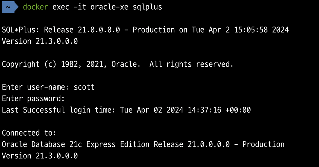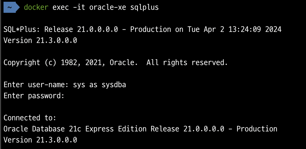 docker exec -it oracle sqlplus