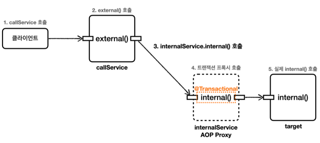 @Transactional 을 메서드나 클래스에 붙이면 해당 객체는 트랜잭션 AOP 적용의 대상이 되고, 결과적으로 실제 객체 대신에 트랜잭션을 처리해주는 프록시 객체가 스프링 빈에 등록된다. 그리고 주입을 받을 때도 실제 객 체 대신에 프록시 객체가 주입된다.