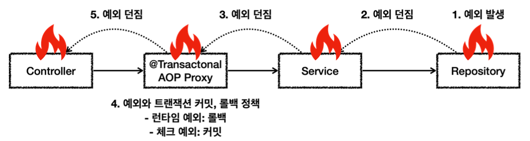 예외가 발생했는데,내부에서 예외를 처리하지 못하고, 트랜잭션 범위(@Transactional가 적용된 AOP)밖으로 예외를 던지면 어떻게 될까?