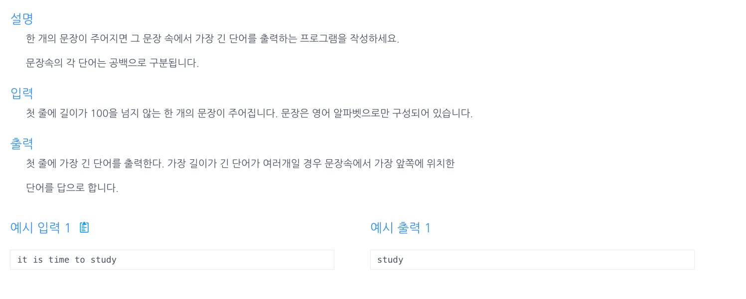 - 잘라진 단어 갯수만큼 루프를 돌면서 단어의 길이를 측정하고, 단어의 길이가 가장 길다면 temp 변수에 저장한다.