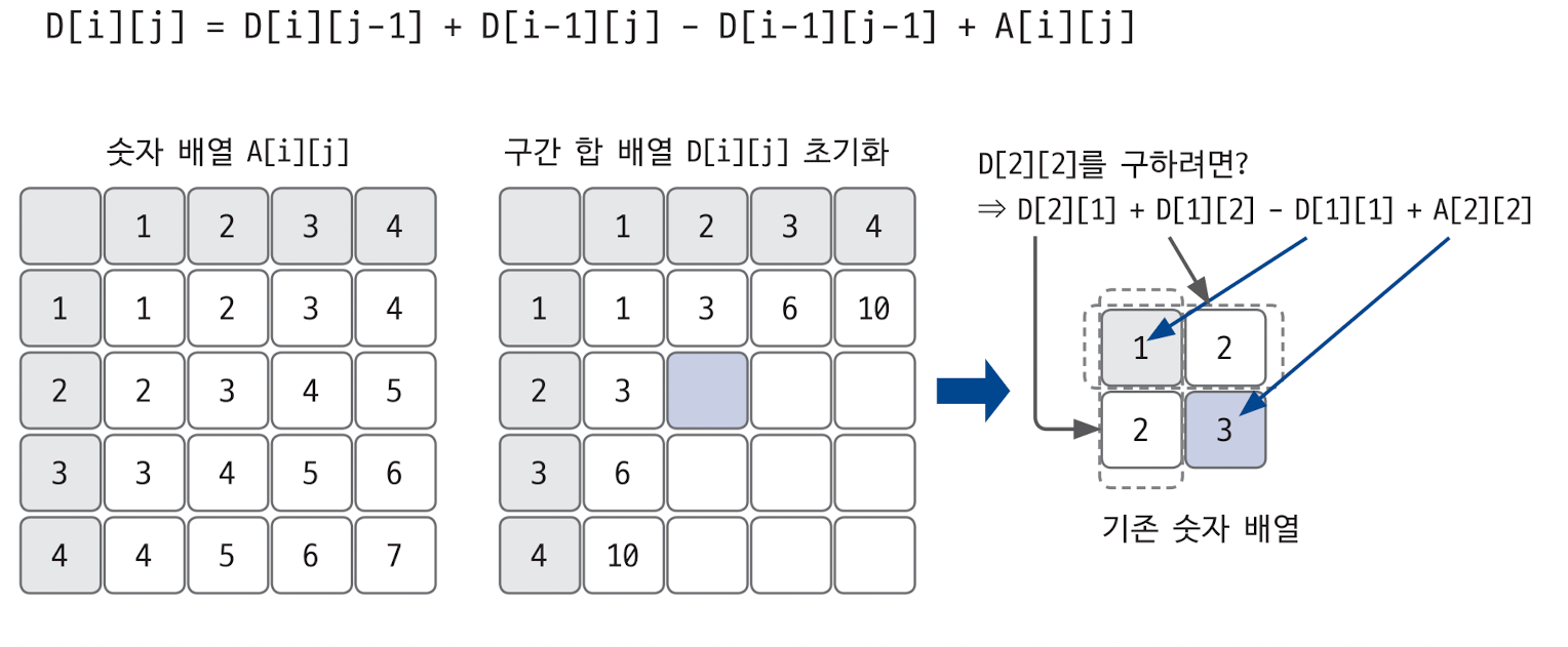 각 칸 (i, j)에 해당하는 누적합을 (왼쪽 값 + 위쪽 값 - 대각선 왼쪽 위 값) 방식으로 저장하여, 특정 부분의 합을 O(1) 연산으로 구할 수 있도록 한다.