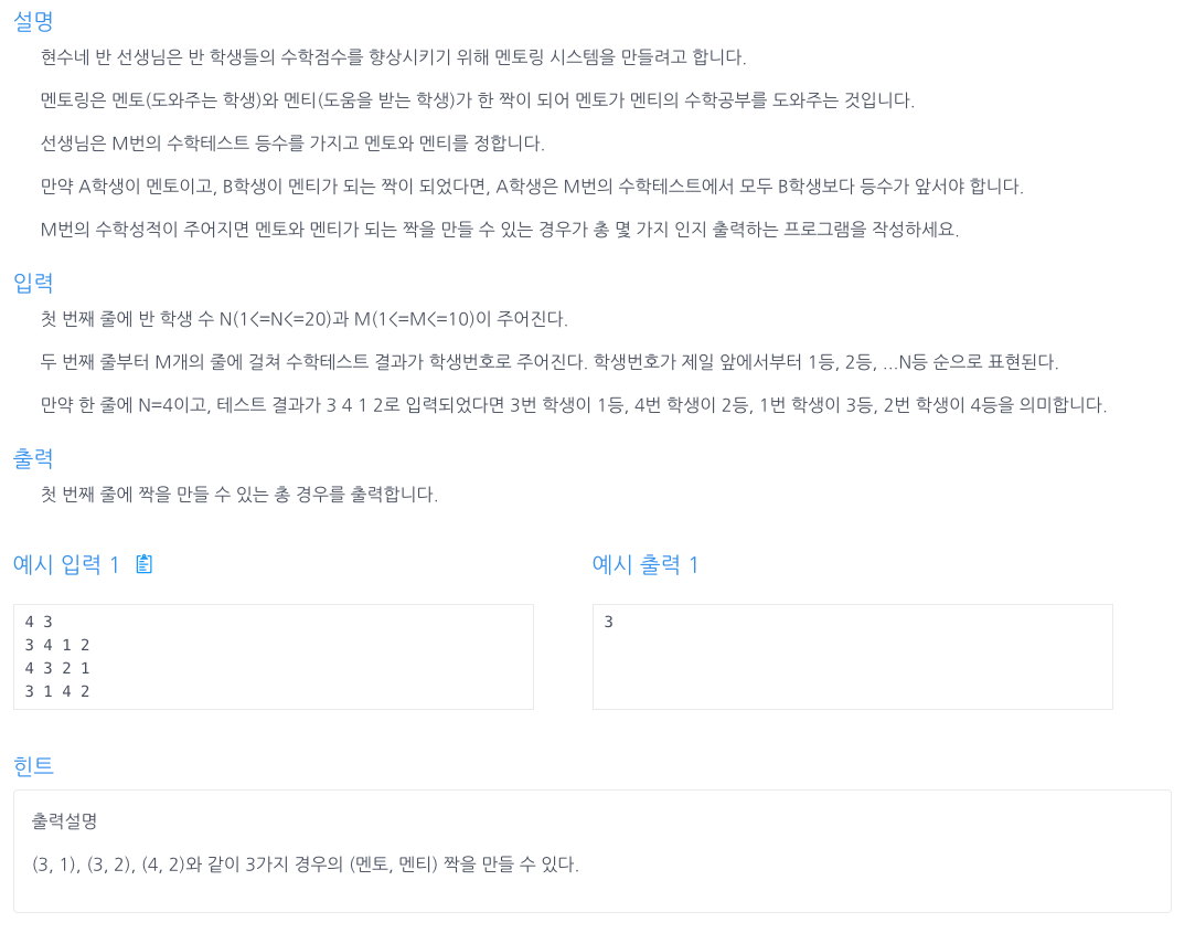 - 예를 들어, rank[0][3] = 2라면, 첫 번째 테스트에서 3번 학생은 세 번째 순위라는 뜻이다.