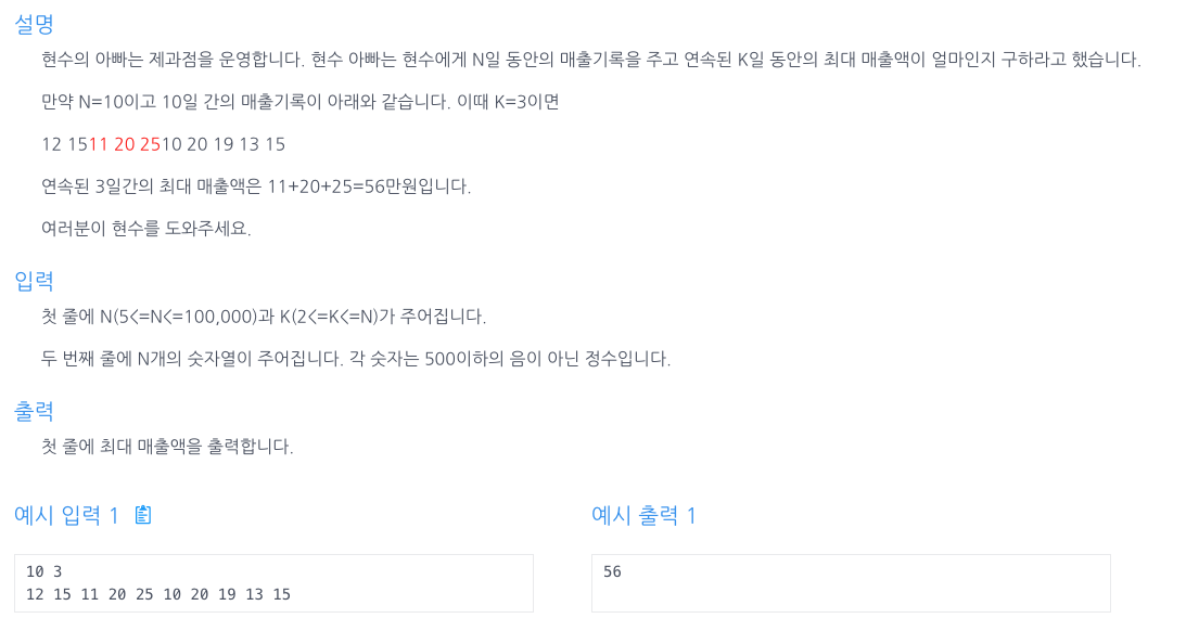 - 두 번째 for 루프에서는 슬라이딩 윈도우 기법을 사용하여 다음 요소를 더하고, 이전 요소를 빼서 새로운 윈도우의 합을 구한다. 이 합이 max보다 크면 max를 갱신한다.