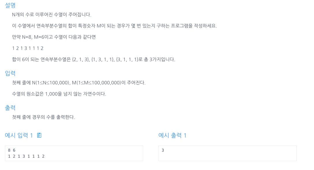 - sum이 M과 같아지면, count를 증가시킨다.
