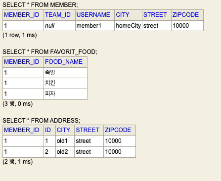 임베디드 타입으로 만들어준 Period와 Address가 모두 Member테이블에 들어가 있다.
