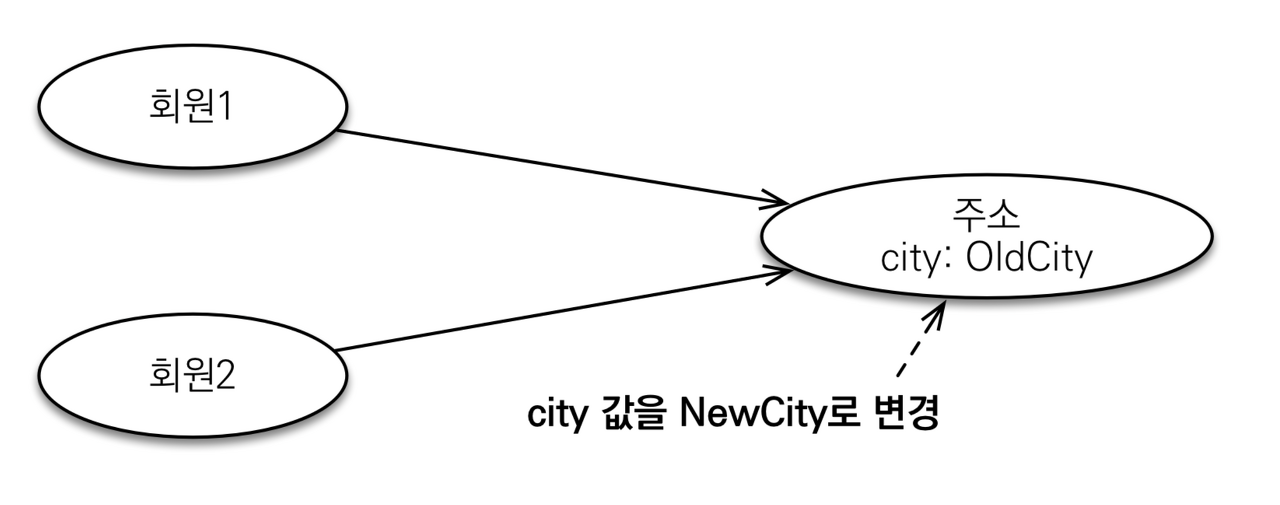 위 그림과 같이 회원1과 회원2의 주소가 같아서, 하나의 Address객체를 만든 뒤 같이 넣어주면 값을 공유하게 된다.
