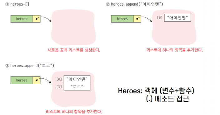 heroes = [ "아이언맨", "토르", "헐크" ]