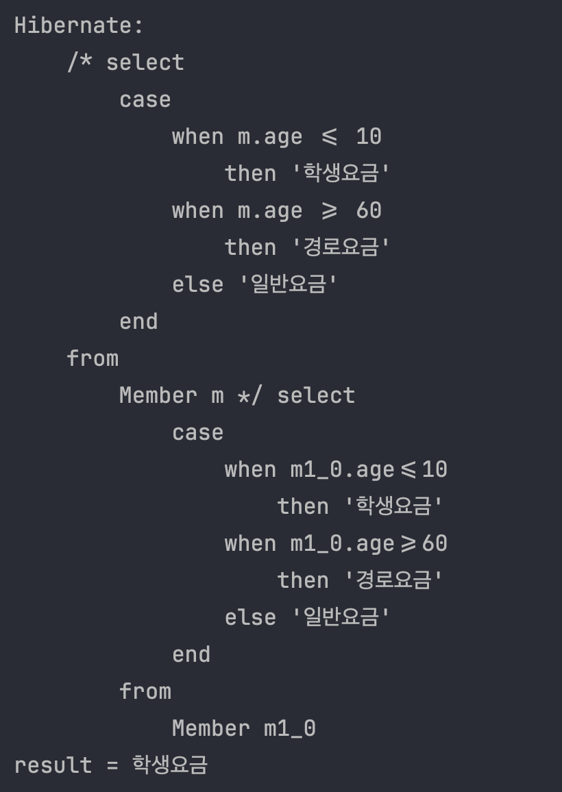 String query = "select case when m.age <= 10 then '학생요금' " +