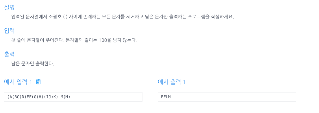 solution 메서드는 문자열에서 괄호로 둘러싸인 부분을 제거하고, 남은 문자열을 반환하는 기능을 한다. 주어진 문자열에서 괄호 내부의 문자는 무시하고, 괄호 외부의 문자들만을 추출하여 결과 문자열을 만든다.