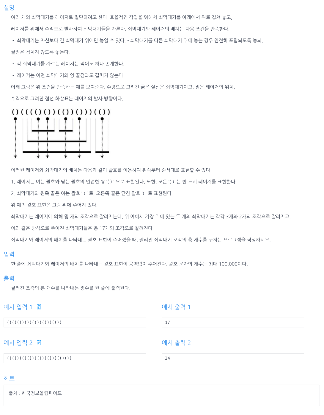 -')'가 나오고 이전 문자가 '('이 아니라면 쇠막대기의 끝을 의미한다. 이 경우 metalStick을 감소시키고, 잘린 막대기의 끝부분을 하나 더해주어야 하므로 count를 1 증가시킨다. - 최종적으로 잘린 쇠막대기 조각의 개수를 반환하여 출력한다.