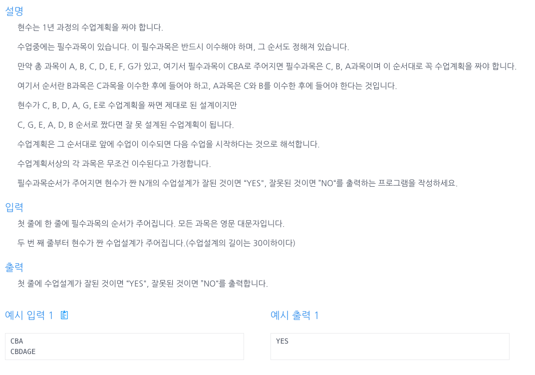 - str 문자열을 모두 확인한 후에도 큐에 문자가 남아 있으면 "NO"를 반환하고, 큐가 비어 있으면 "YES"를 반환한다. 이는 sequence의 모든 문자가 str에 순서대로 존재하면 "YES", 그렇지 않으면 "NO"를 반환하는 것이다.