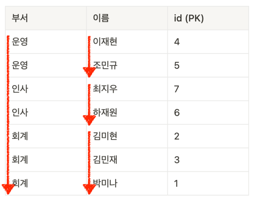 이런 구조로 되어 있기 때문에 부서 컬럼만 놓고 봤을 때는 부서 인덱스와 동일한 정렬 상태를 갖고 있다.