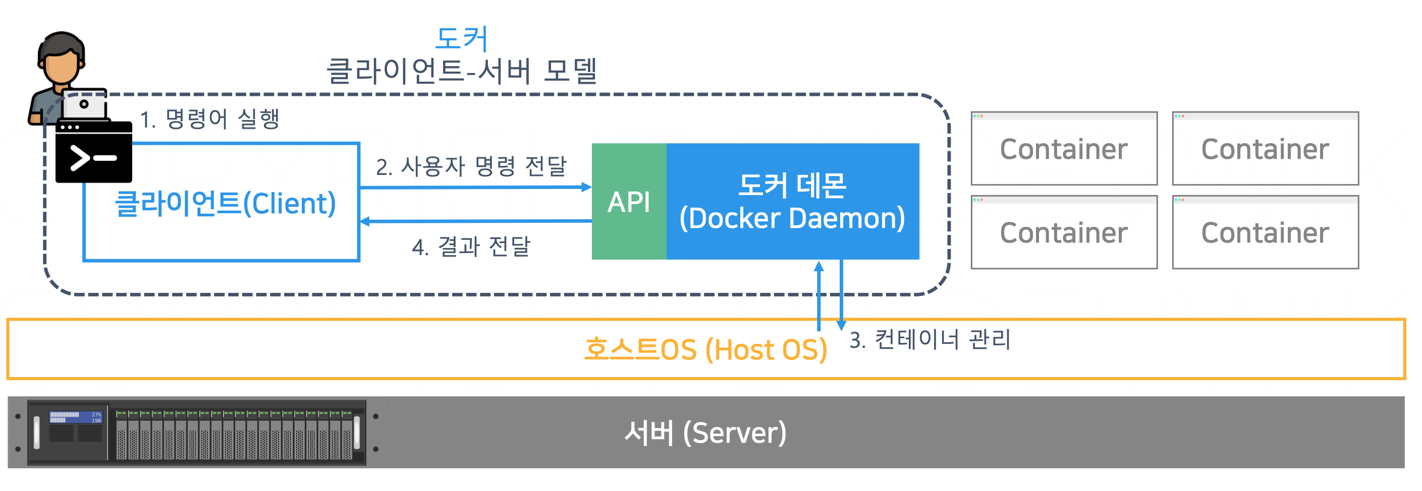 - 사용자는 클라이언트에서 명령어를 실행하면, 해당 명령은 API를 통해 도커 데몬으로 전달된다.