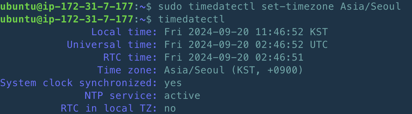 sudo timedatectl set-timezone Asia/Seoul위 명령어를 입력하면 타임존을 아시아/서울로 변경할 수 있다.
