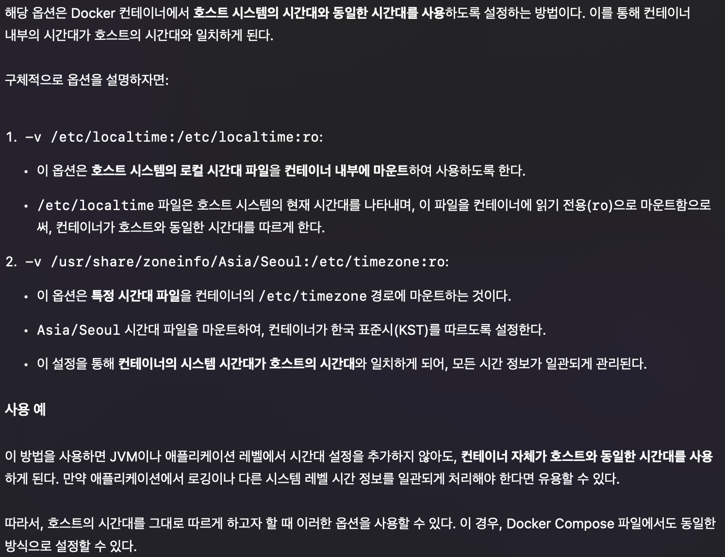 내 프로젝트는 도커 컴포즈를 이용하고 있는데 아래의 옵션을 주면 호스트 시간대와 도커 컨테이너 시간대와 동기화된다는 것을 알았다.