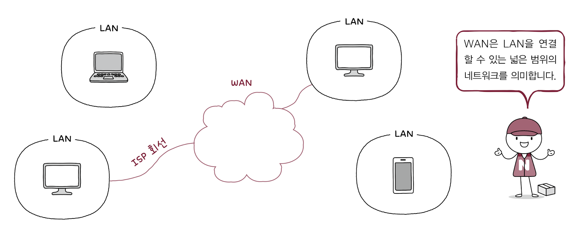 - 멀리 떨어진 LAN을 연결할 수 있는 네트워크가 바로 WAN이다.